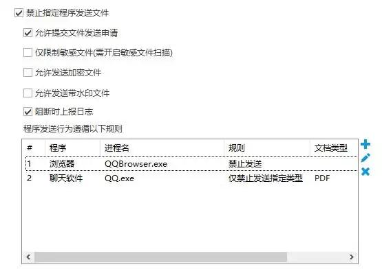 程序管控:禁止通过微信/钉钉发送敏感文件,支持自定义禁止程序列表;